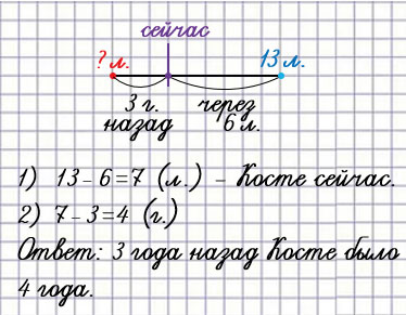 29. Через 6 лет Косте будет 13 лет. Сколько лет было Косте 3 года назад?
