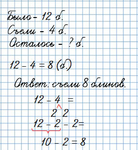 22. Бабушка испекла 12 блинов. После обеда осталось только 4 блина. Сколько блинов съели за обедом?