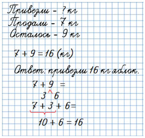 1) В магазин привезли несколько килограммов яблок. За день продали 7 кг яблок и осталось 9 кг. Сколько килограммов яблок привезли?