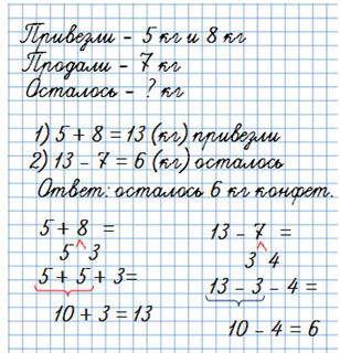 2) В буфет привезли 5 кг карамельных конфет и 8 кг шоколадных. За день продали 7 кг конфет. Сколько килограммов конфет осталось?