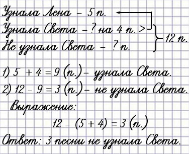 3. Девочки участвовали в игре "Угадай мелодию". Лена из 12 песен узнала только 5, а Света узнала не только те, что и Лена, но и ещё 4 песни. Сколько песен не узнала Света?