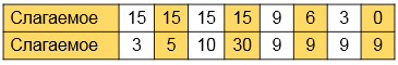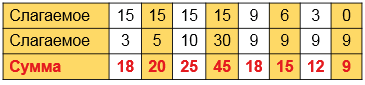 | 15 + 30 = 10 + 5 + 30 = (10 + 30) + 5 = 40 + 5 = 45 | 0 + 9 = 9 |
