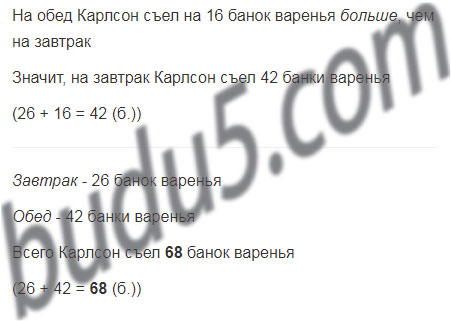 Собираясь в гости к своей бабушке, Карлсон решил подкрепиться. Для этого на завтрак он съел 26 банок варенья, а на обед - на 16 банок больше. Сколько банок варенья съел Карлсон?