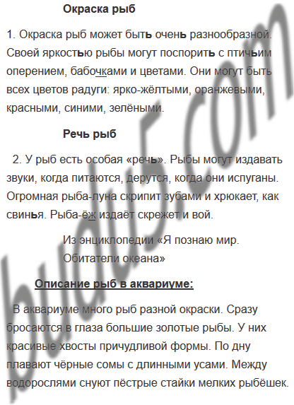 2. У рыб есть особая «реч..». Рыбы могут издавать звуки, когда питаются, дерутся, когда они испуганы. Огромная рыба-луна скрипит зубами и хрюкает, как свин..я. Рыба-ёж… издаёт скрежет и вой.