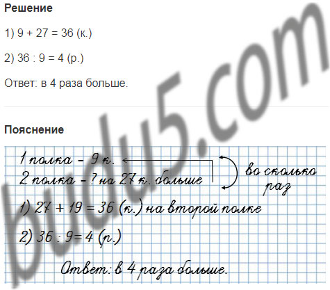 7. На верхней полке 9 книг, а на нижней - на 27 книг больше. Во сколько раз больше книг на нижней полке, чем на верхней?