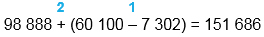 98 888 + (60 100 - 7 302) = 151 686
