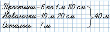 1) 1 м 80 см • 6 = 10 м 80 см - на простыни.