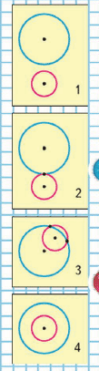 На обоих рисунках две окружности: большая голубая и маленькая розовая. На третьем рисунке окружности имеют две общие точки, а на четвёртом рисунке одна окружность расположена внутри другой и окружности не имеют общих точек.