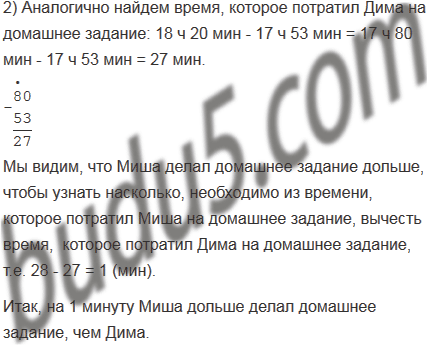 Миша делал домашнее задание по математике с 16 ч 48 мин до 17 ч 16 мин, а Дима - с 17 ч 53 мин до 18 ч 20 мин. Кто из мальчиков дольше делал задание и на сколько минут?