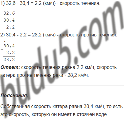 Скорость катера по течению реки равна 32,6 км/ч, а его собственная скорость - 30,4 км/ч. Найдите скорость течения и скорость катера против течения реки.