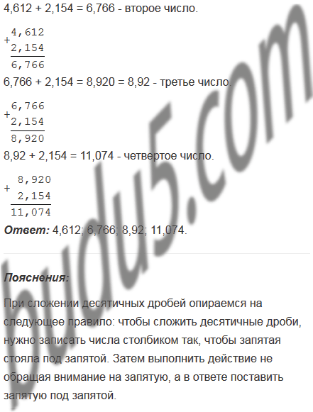 Запишите 4 числа, первое из которых 4,612, а каждое следующее на 2,154 больше предыдущего.