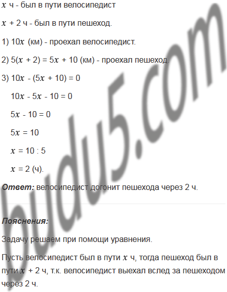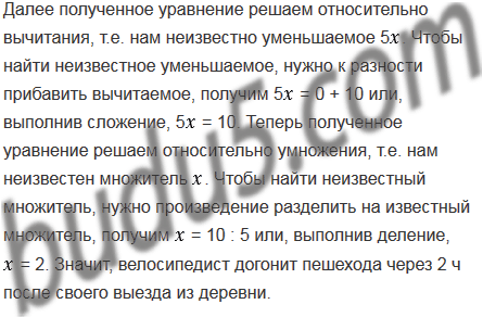 Из деревни вышел пешеход, а через 2 ч вслед за ним выехал велосипедист. Скорость велосипедиста 10 км/ч, а скорость пешехода 5 км/ч. Через сколько времени после своего выезда велосипедист догонит пешехода?