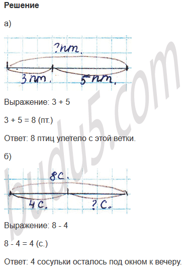 а) С ветки улетели сначала 3 птицы, а потом 5 птиц. Сколько всего птиц улетело с этой ветки?