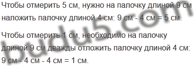 Задание № 9. У Димы 2 палочки длиной 9 см и 4 см. Как ему отмерить 5 см? Как ему отмерить 1 см?