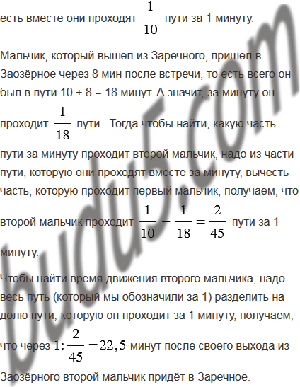 Из сёл Заречное и Заозёрное одновременно навстречу друг другу вышли два мальчика и встретились через 10 мин после начала движения. Затем мальчики продолжали движение в тех же направлениях, и один из них пришёл в Заозёрное через 8 мин после встречи.Через сколько минут после своего выхода из Заозёрного второй мальчик придёт в Заречное?