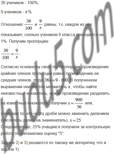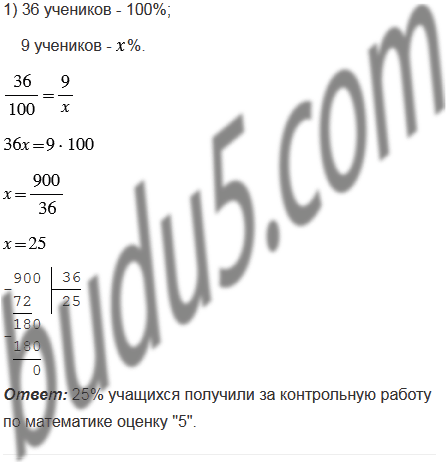 1) Из 36 учеников 6 класса девять учащихся получили за контрольную работу по математике оценку "5". Сколько процентов учащихся получили оценку "5"?