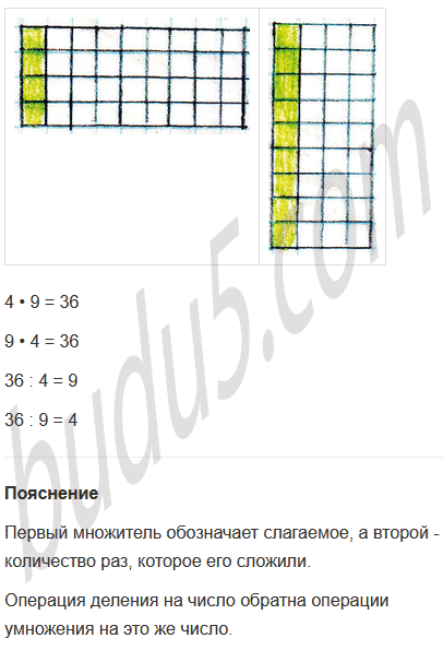 Задание № 1. Пользуясь таблицей умножения, построй графическую модель и составь 4 равенства из чисел: а) 3, 5, 15; б) 4, 9, 36.