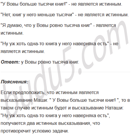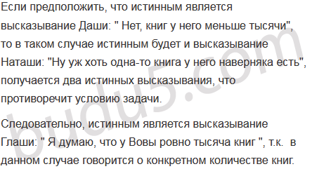 "У Вовы больше тысячи книг!", - заявила Маша. "Нет, книг у него меньше тысячи", - возразила Даша. "Я думаю, что у Вовы ровно тысяча книг", - предположила Глаша. "Ну уж хоть одна-то книга у него наверняка есть", - сказала Наташа. Сколько книг у Вовы, если среди этих четырех высказываний только одно истинное?