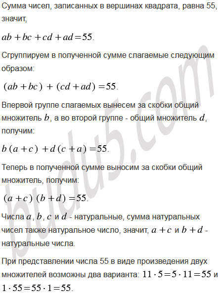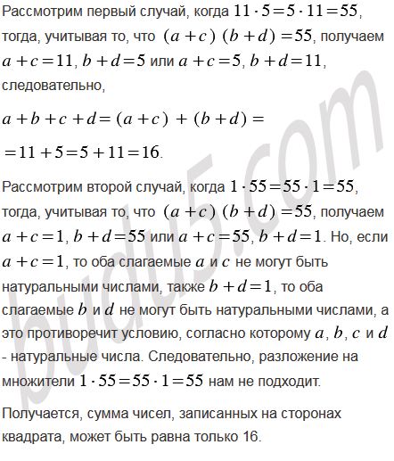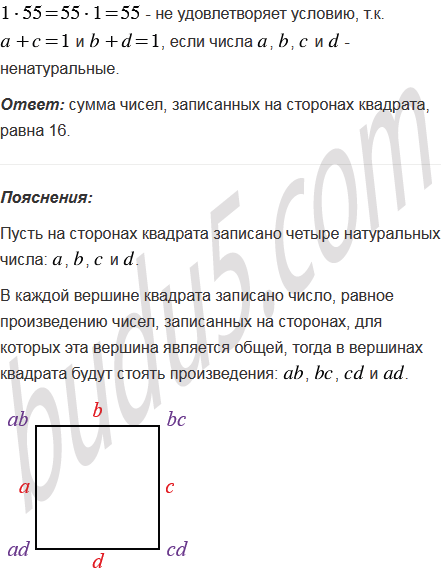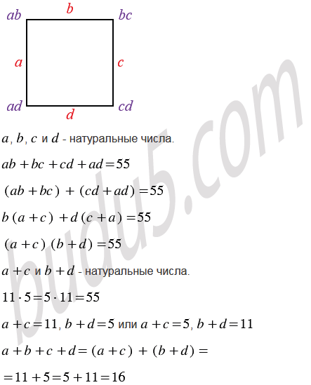 На сторонах квадрата записаны четыре натуральных числа. В каждой вершине квадрата записано число, равное произведению чисел, записанных на сторонах, для которых эта вершина является общей. Сумма чисел, записанных в вершинах, равна 55. Найдите сумму чисел, записанных на сторонах квадрата.