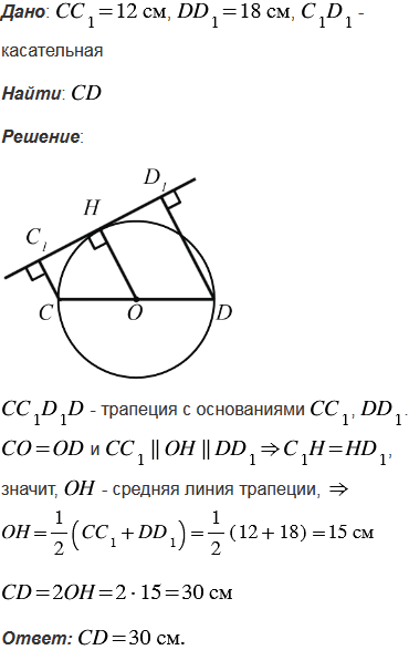 Найдите диаметр окружности, если его концы удалены от некоторой касательной на 18 см и 12 см.