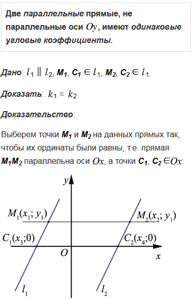 , имеют одинаковые угловые коэффициенты; если две прямые имеют одинаковые угловые коэффициенты, то эти прямые параллельны.