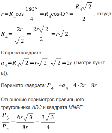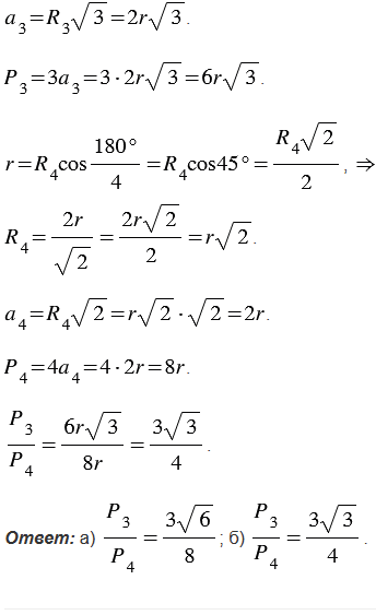 Найдите отношение периметров правильного треугольника и квадрата: а) вписанных в одну и ту же окружность; б) описанных около одной и той же окружности.