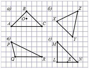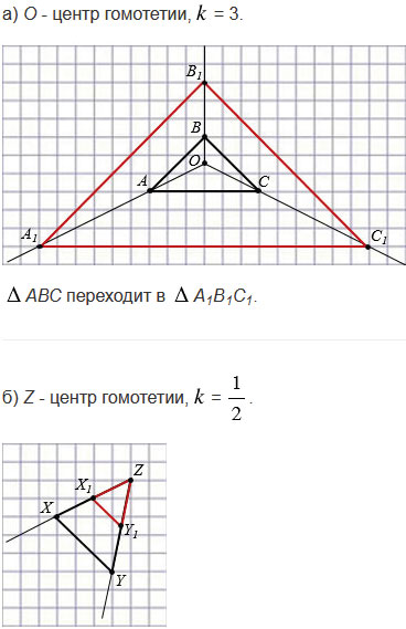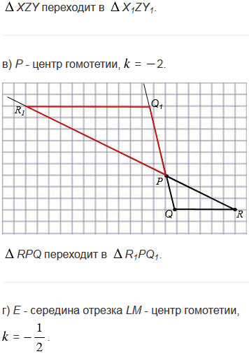 Перечертите рисунок 401, а-г в тетрадь и постройте треугольники, в которые переходят данные треугольники, при гомотетии с данным центром О и коэффициентом: а) ABC, центр гомотетии О, = 3; б) XYZ, центр гомотетии Z, = ; в) PQR, центр гомотетии P, = –2; г)  LMN, центр гомотетии E середина отрезка LM, =.