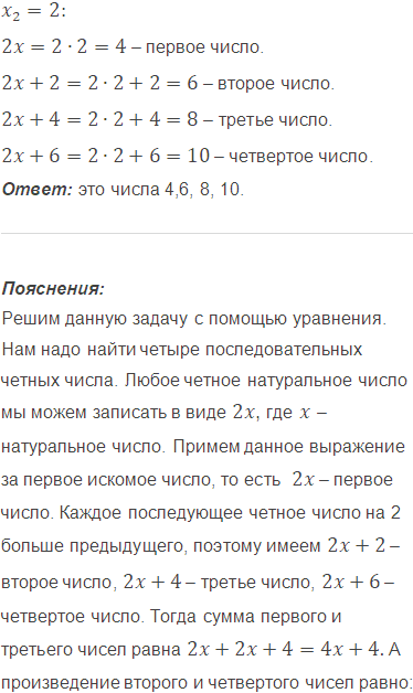 Найдите четыре последовательных чётных натуральных числа, если сумма первого и третьего чисел в 5 раз меньше, чем произведение второго и четвёртого чисел.