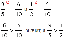 | Чтобы сравнить две дроби с разными знаменателями, надо: 1) привести данные дроби к общему знаменателю; 2) применить правило сравнения дробей с одинаковыми знаменателями. |
