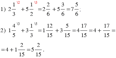 | Чтобы выполнить сложение смешанных чисел, нужно: 1) привести дробные части этих чисел к наименьшему общему знаменателю; 2) отдельно выполнить сложение целых частей и отдельно дробных частей. Если при сложении дробных частей получилась неправильная дробь, выделить целую часть из этой дроби и прибавить ее к полученной целой части. |