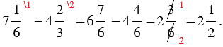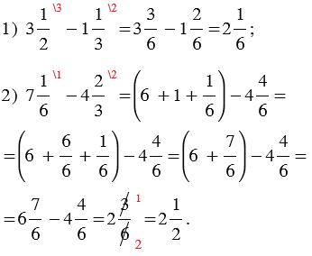 | Чтобы выполнить вычитание смешанных чисел, нужно: 1) привести дробные части этих чисел к наименьшему общему знаменателю; если дробная часть уменьшаемого меньше дробной части вычитаемого, превратить ее в неправильную дробь, уменьшив на единицу целую часть; 2) отдельно выполнить вычитание целых частей и отдельно дробных частей. |