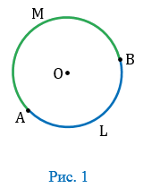 На рисунке 1 две точки А и В разделяют окружность на две дуги. На каждой дуге отмечают промежуточную точку, например L и М, для того, чтобы различать эти дуги. Обозначают дуги так: